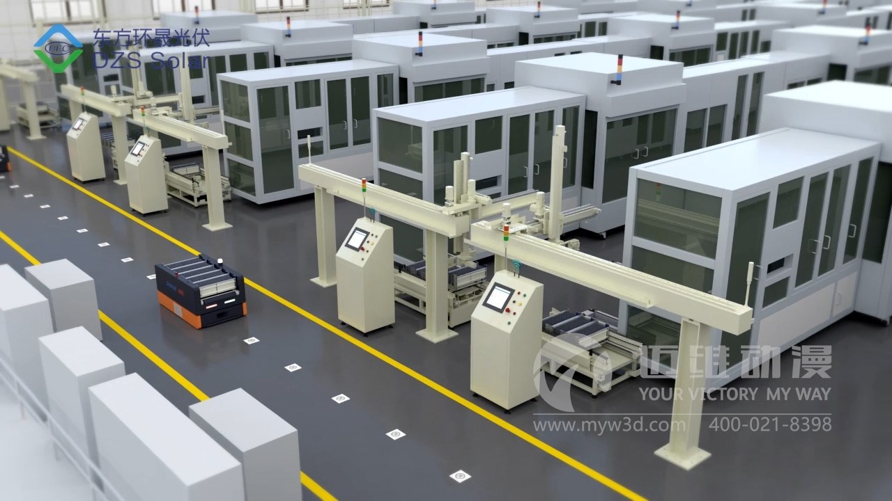 迈维动漫公司专注于高品质光伏芯片生产车间物流自动化生产工艺三维动画设计。采用先进的3D动画技术,展现制绒下料口的全景。